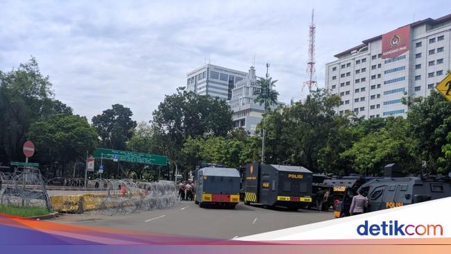 Sementara ratusan aparat polisi telah siaga di lokasi. Polisi memasang kawat barrier di Jl Medan Merdeka Barat.