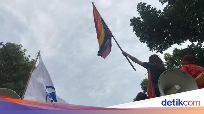 Saat di lokasi, terlihat beberapa massa yang mengenakan gelang pelangi khas LGBT. Ada juga bendera pelangi yang dibentangkan di atas mobil komando.
