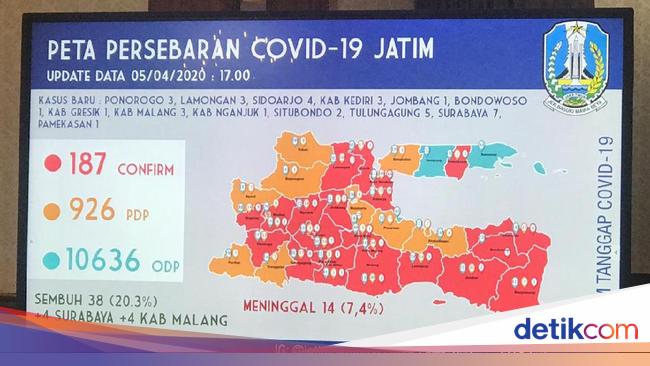Jumlah pasien positif corona di Jawa Timur bertambah 35 orang, total 187 kasus. Tambahan pasien tersebut berasal dari 13 kabupaten/kota di Jatim. Tambahan 35 kasus baru di Jatim di antaranya berasal dari dua wilayah yang sebelumnya masih zona kuning.