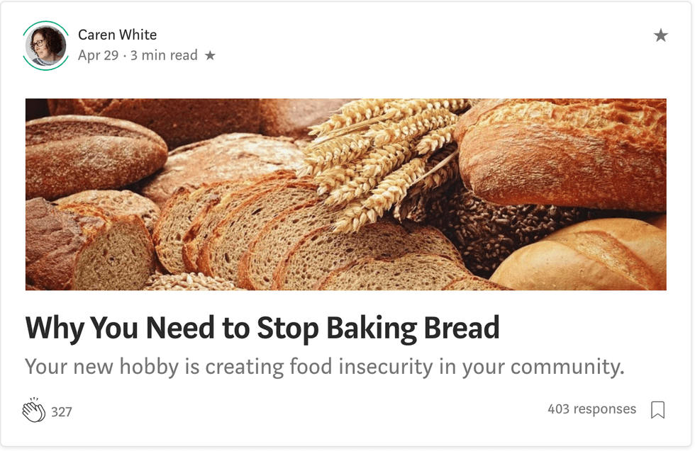 On Medium this week, one woman wrote a post titled "Why You Need To Stop Baking Bread" and subtitled 'Your new hobby is creating food insecurity in your neighborhood."