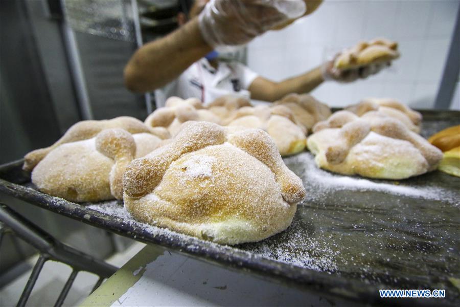A baker arranges newly-made "pan de muerto", or a type of traditional Mexican bread, at a bakery in Mexico City, capital of Mexico, Oct. 27, 2020. Making "pan de muerto" is one of the most important traditions of the Day of the Dead celebrations. (Photo by Montserrat Lopez/Xinhua)